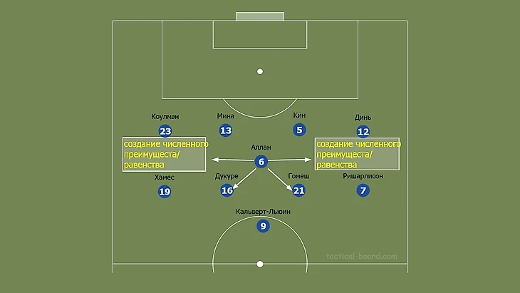 2. В начале игры, а именно, в первые 15 минут встречи, когда «Эвертон» активно владел мячом, можно было заметить построение в позиционную атаку по схеме 2-3-5. Два центральных защитника расположены высоко в пределах центрального круга. Гомеш опустился к Дукуре и Аллану, образовав линию из трех полузащитников. Крайние защитники Динь и Коулмэн поднялись высоко на позиции вингеров. Ришарлисон и Хамес сместились в полуфланги между центральными и крайними защитниками «Тоттенхэма». Кальверт-Льюин на своей позиции между центральными защитниками.