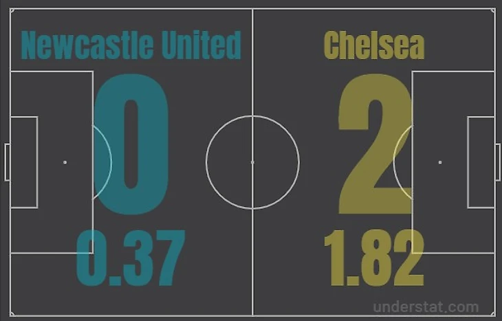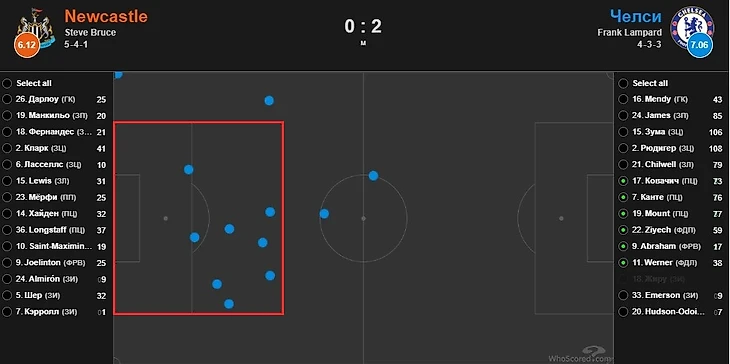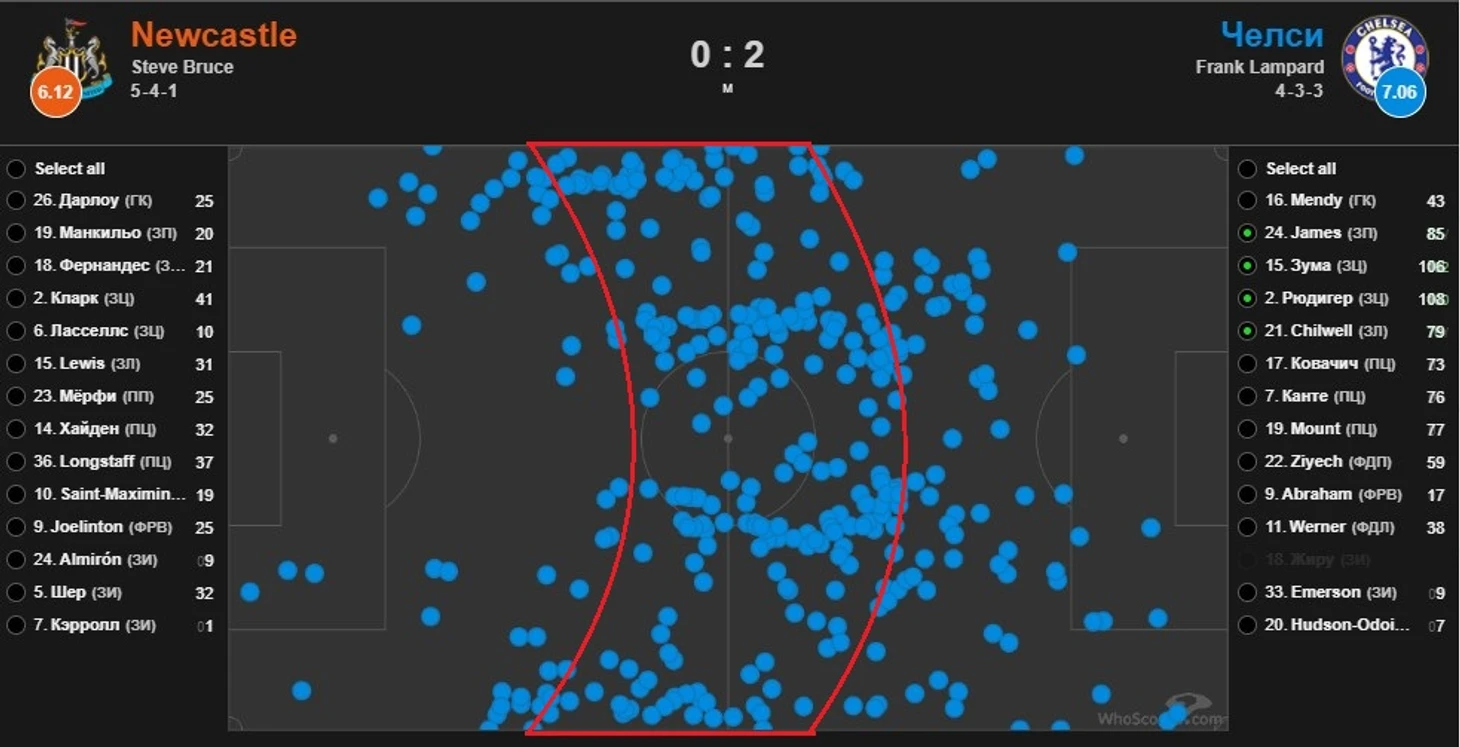 После перестроения игра «Ньюкасла» стала немного острее. Потенциально игроки могли создать голевой момент у ворот «Челси». Но все те удары, что были нанесены, по показателям xG, несли малую опасность. Три удара во втором тайме из-за пределов штрафной площади – xG=0,02; 0,02; 0,05. Два удара из пределов штрафной площади от Энди Кэрролла и Альмирона – xG=0,05 и 0,03, соответственно.