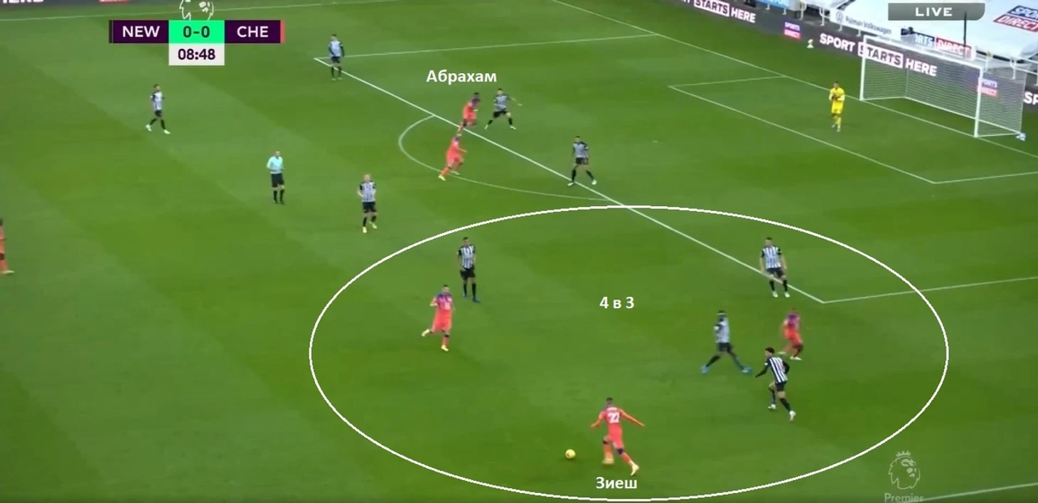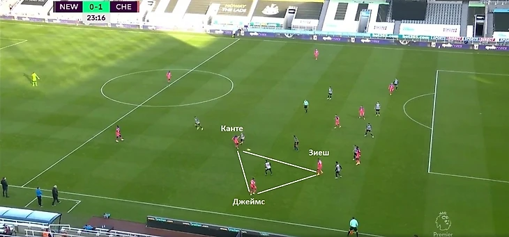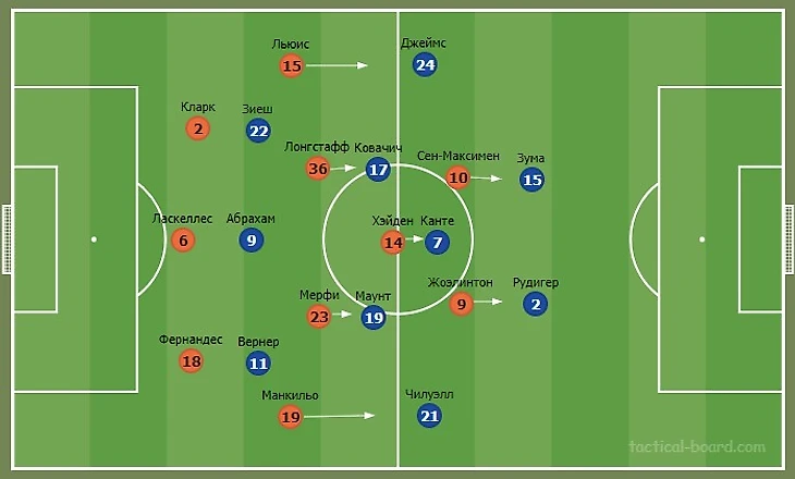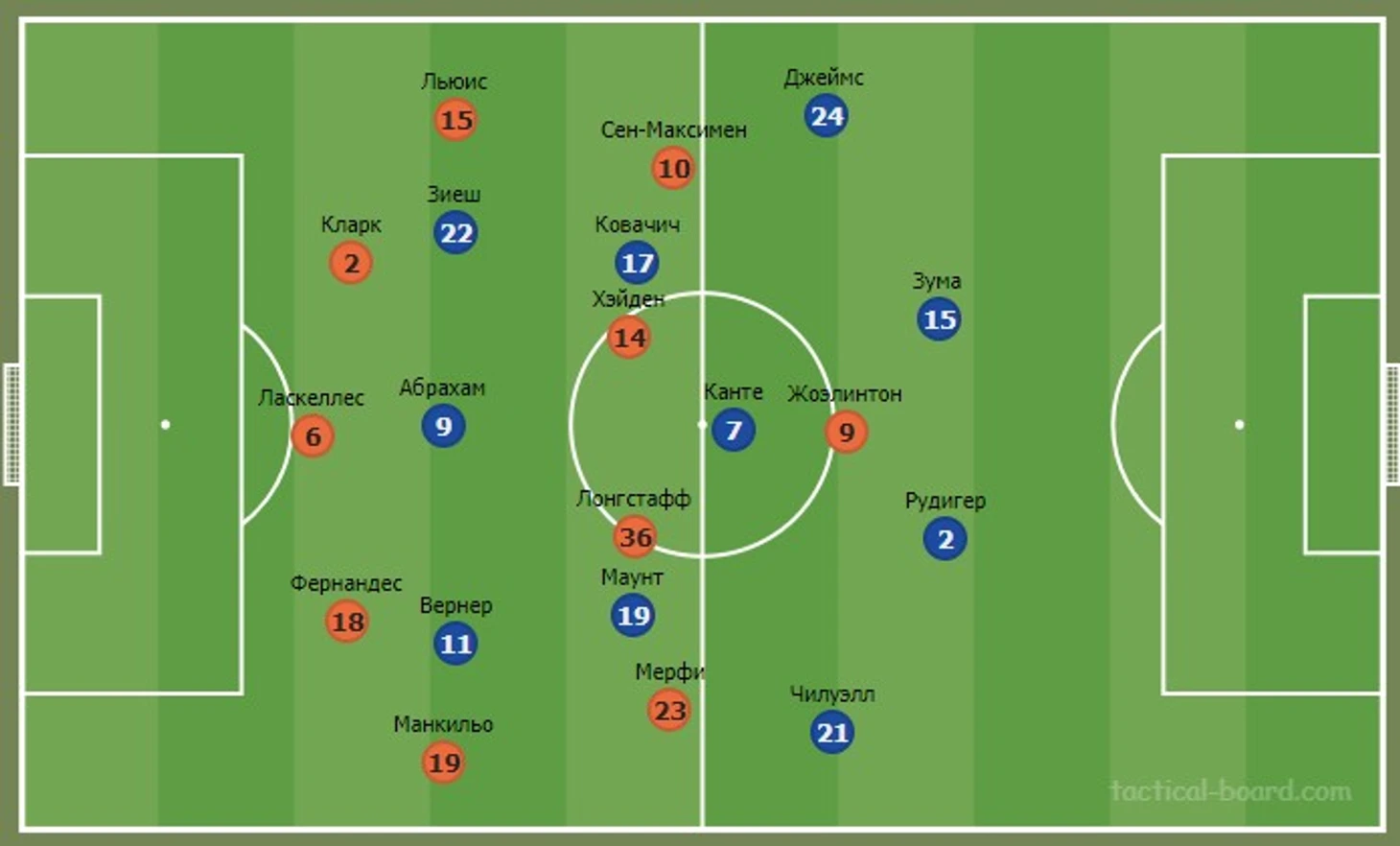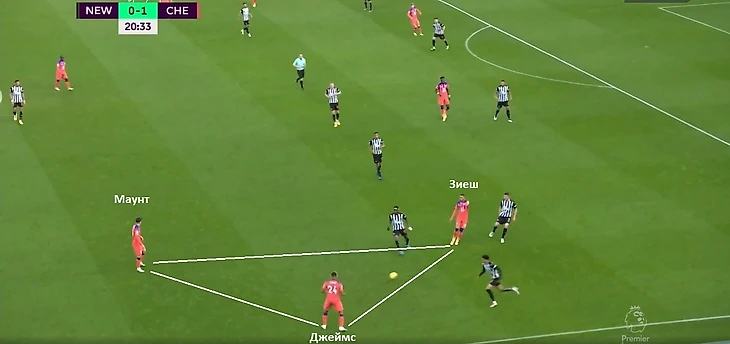 Ситуативно на фланг смещался Канте, когда Маунт заполнял пространство между линиями обороны «Ньюкасла». Но эффективность сохранялось, и зона за спиной защитников открывалась за счет Зиеша, который стягивал на себя игрока.