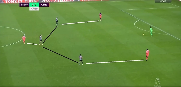 5. Во второй половине первого тайма Сен-Максимен стал чаще подниматься из линии полузащиты, оказывая давление на одного из центральных защитников «Челси». Таким образом, складывалась ситуация 2 в 2. Однако это никак не препятствовало продвижению мяча, так как Канте создавал треугольник с центральными защитниками и всегда был открыт под передачу. Наоборот, такое высокое расположение Сен-Максимена создавала трудность для центрального полузащитника «Ньюкасла», который одновременно держал Ковачича и играл по Канте.