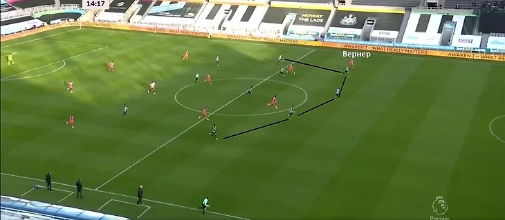В данном эпизоде можно отметить то, что высокое расположение латералей «Ньюкасла» при организации собственной атаки, могло привести к подобным контратакам со стороны «Челси». Несмотря на то, что крайние центральные защитники прикрывали потенциально опасные полуфланги, фланги обороны были открыты. Вернер использует это за счет широкого расположения при контратаке, и на скорости продвигает мяч до штрафной площади. Еще один способ создания голевого момента.