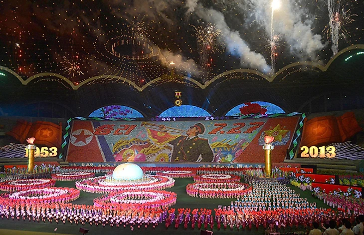 На 150 000-м (еще раз: сто пятьдесят тысяч!) стадионе проходит множество матчей местных клубов и игры национальной сборной, хотя главное его предназначение – в «Ариране». Это поражающее масштабностью музыкально-гимнастическое мероприятие, главная цель которой широко, богато и пафосно напомнить миру о величии партии.