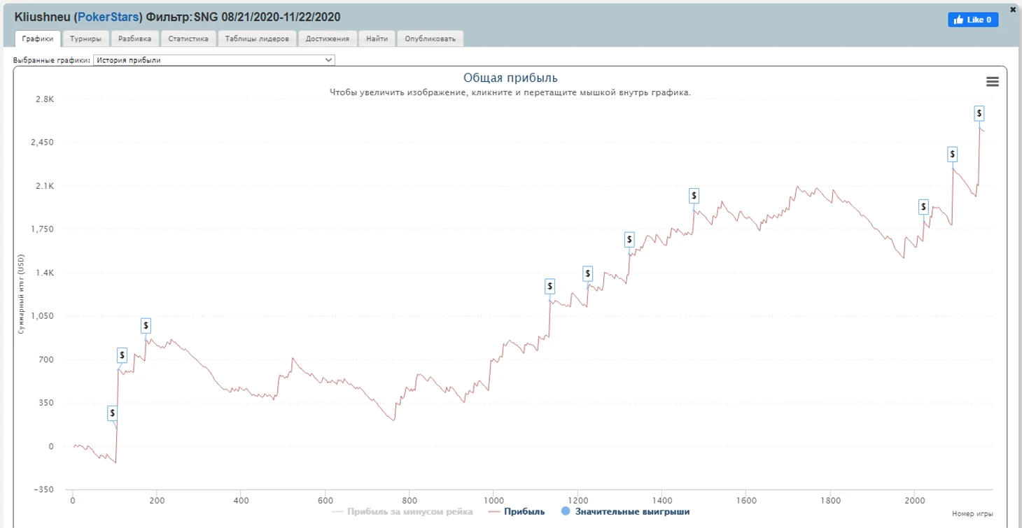 Увы, достичь поставленной цели мне не удалось. Я отыграл меньше, чем планировал - 2165 MTSnG-турниров из 3000. Общие показатели ROI и ITM составили 27% и 17% соответсвенно. Заработано $2540. К сожалению, цель марафона не выполнена.