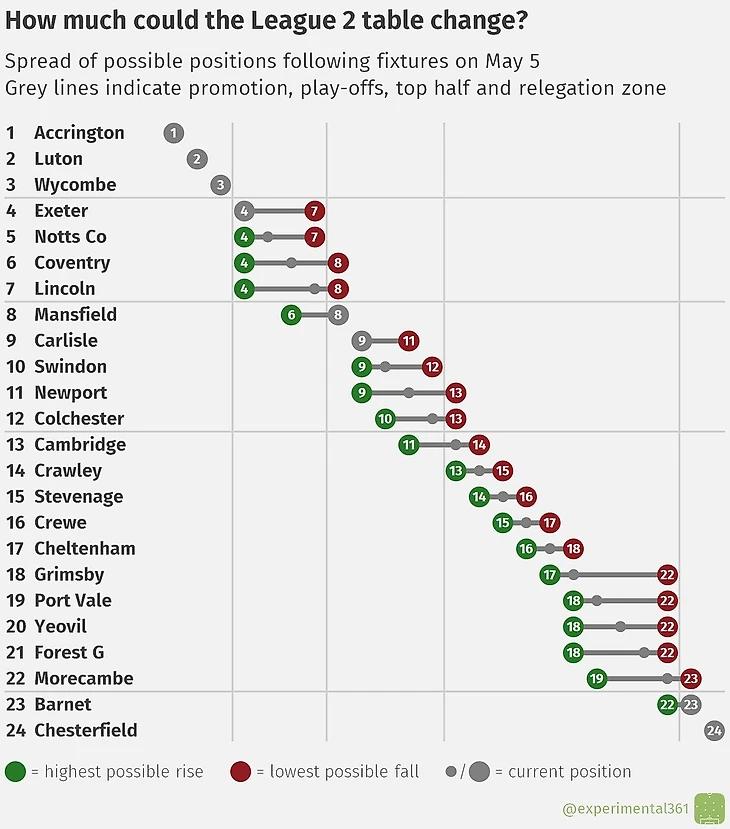 В Лиге2 три прямых путевки на повышение уже разыграны, а вот «Мансфилд» (домашний матч против потерявших особую мотивацию «Кроули») может потеснить «Линкольн» (домашний матч против уже на 100% спасшегося «Йовила») или «Ковентри» (матч дома против спасающегося от вылета «Моркэмба»)