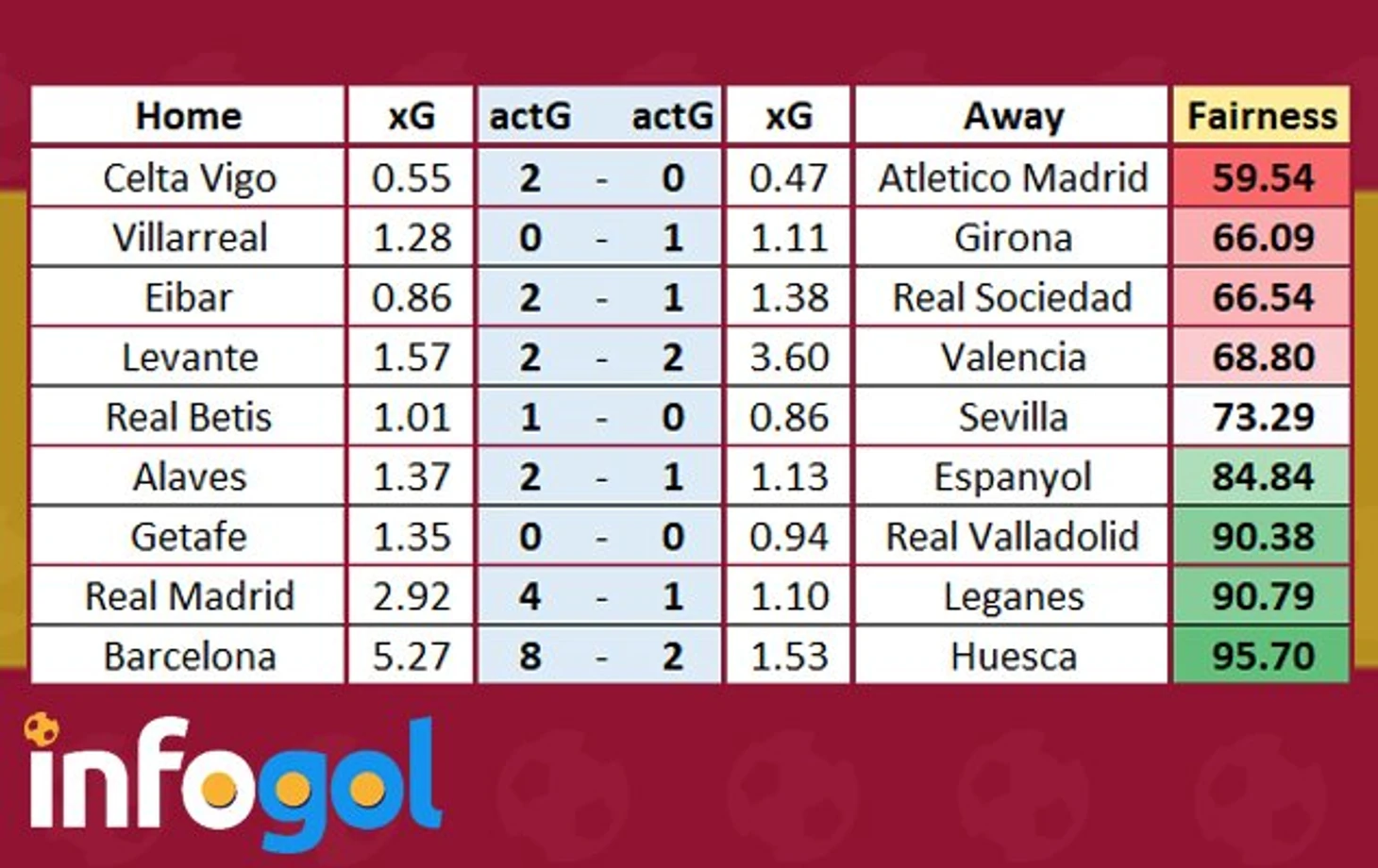 Оценка справедливости результатов 3-го тура Ла Лиги от Infogol