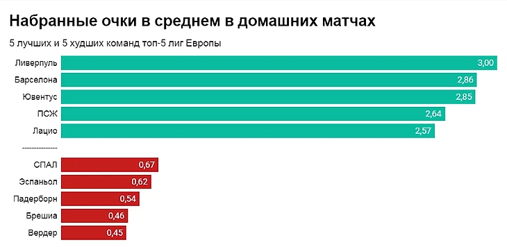 Примечательно, что в топ-5 худших домашних команд топ-лиг по забитым в среднем мячам представлено по одной команде из каждой лиги.
