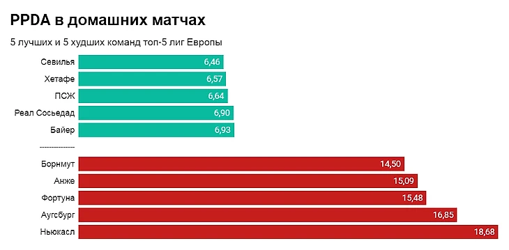 Худший показатель PPDA у «Ньюкасла». «Сороки» также были худшими в плане интенсивности прессинга и в выездных матчах.