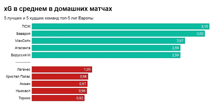 Присутствие в топе команд с наибольшим домашним xG «ПСЖ», «Баварии» и «МанСити» вряд ли кого-то удивляет, да и «Аталанта» в этом сезоне хороша в атаке.