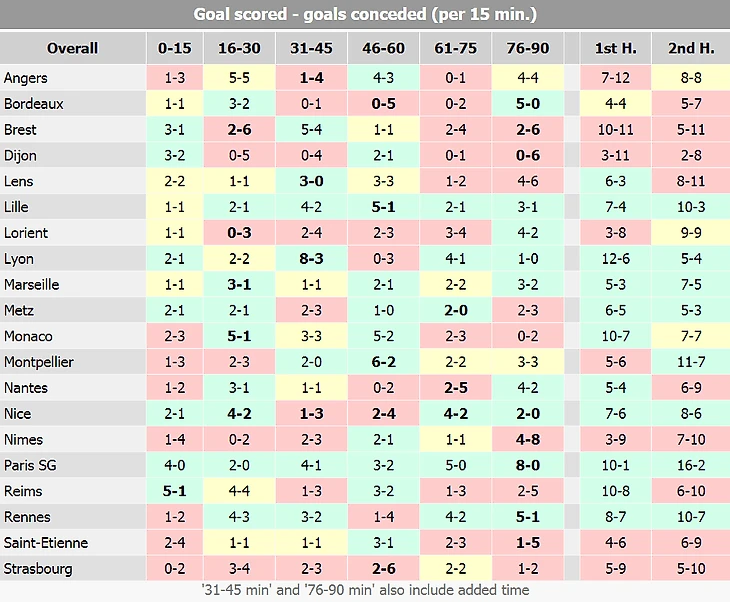 Лилль, Марсель и ПСЖ имеют положительный баланс забитых/пропущенных мячей на каждом из выделенных 15-минутных отрезках.