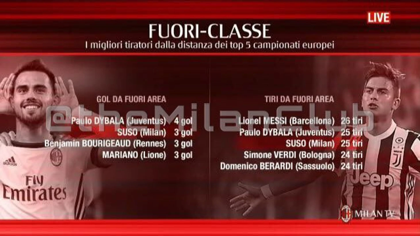 ● Инфографика: Сусо и Пауло Дибала в топ-5 по показателю эффективности дальних ударов (число забитых мячей/общее количество ударов из-за пределов штрафной)