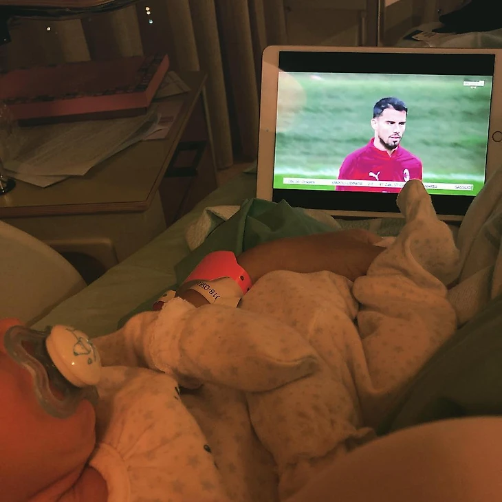И даже находясь в роддоме, Алиша не могла пропустить игру ее любимого Хесуса. А Аллессио впервые понаблюдал за своим отцом на поле :)