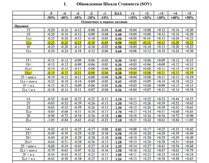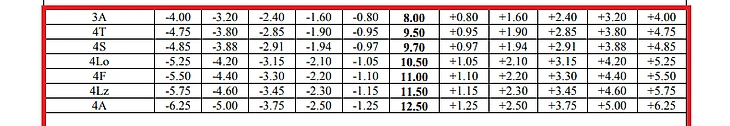 Как известно, в Акселе -- в отличие от остальных прыжков -- не целое количество оборотов: в одинарном -- один с половиной, двойном -- два с половиной, а в тройном -- три с половиной. Так что с таким же успехом Аксель в полтора оборота можно было назвать двойным, Аксель в два с половиной оборота - тройным, а Аксель в три с половиной оборота - четверным. Но назвали так, как назвали. Видимо, кому-то на заре фигурного катания показалось, что Аксель в полтора оборота лучше называть Акселем одинарным (1А), а дальше -- по мере увеличения фигуристами количества оборотов -- в названии просто прибавляли единичку. В общем, действовали в соответствии с известной народной мудростью, которая на русском языке звучит следующим образом: «Назови меня хоть горшком, только в печку не ставь». Точно также рассуждали и те, кто в течение последних 17 лет разрабатывали и модернизировали судейскую шкалу стоимости прыжков фигуристов. Давайте в неё заглянем.