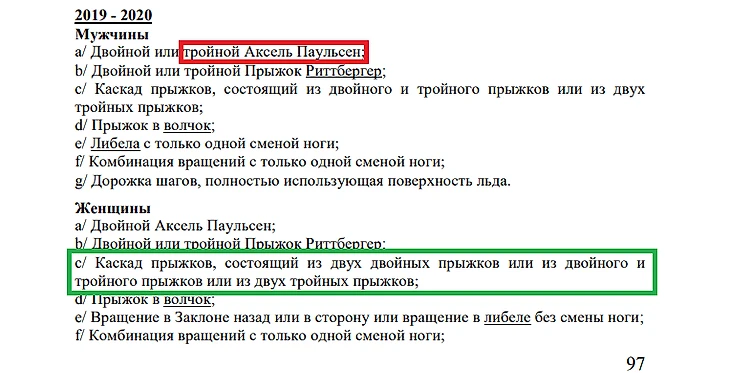 То же кстати касается и пресловутого запрета на квады в КП у женщин. Подлые враги нигде не прописывали, что Александре Трусовой запрещено исполнять квады в КП, чтоб её преимущество не было слишком большим. Просто когда писалась действующая редакция правил, никто не предполагал ещё, что женщины освоят квады, и потому просто не дописали не нужное, как тогда казалось "... или четверной".
