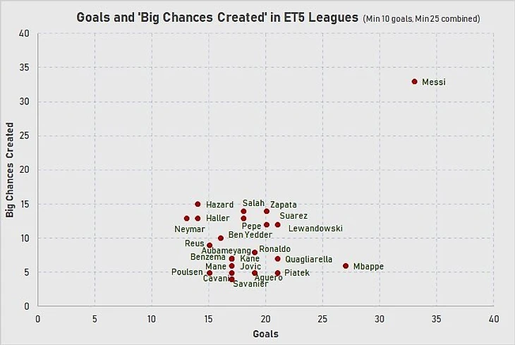 Мир знал великих бомбардиров, великих плеймейкеров, великих мастеров паса и продвижения мяча вперед, великих дриблеров, великих исполнителей штрафных ударов. Месси же сочетает в себе каждый из перечисленных аспектов и превосходит в них виртуозов прошлого и настоящего, доведя эти навыки практически до совершенства. Статистика и видео в помощь. Тем, кто предпочитает цифры и графики вместо просмотра, вот еще один..График голов и созданных убойных голевых шансов прошлого сезона говорит сам за себя: Месси где-то в стратосфере. Наглядная картина разницы между ним и всеми остальными. Просто математика, ничего личного. Черданцеву бы показать, а то для него "очень странно", видите ли, что ЗМ вручили Лео.