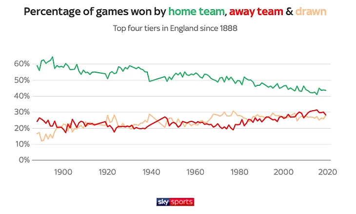 Как посчитал Sky Sports, в 1888 году домашняя команда побеждала в 59% матчей, к 2020-му этот показатель достиг 45%. По этому исследованию видно, что кривые очень медленно, но очень уверенно идут друг к другу и, возможно, когда-нибудь сойдутся.