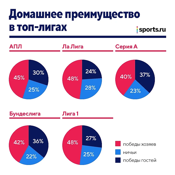 В топ-5 статистика более-менее одинаковая – нет ни одной лиги с процентом домашних побед ниже 40 и ни одной выше 48%. А вот в РПЛ домашнее преимущество наименее выражено. Но на самом деле это данные только одного сезона – например, процент прошлого – 43, что уже не так отличается от остальных.