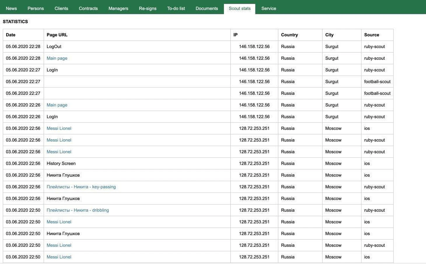Ниже – журнал действий скаута одного из московских клубов.