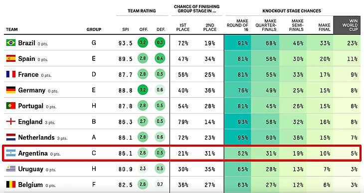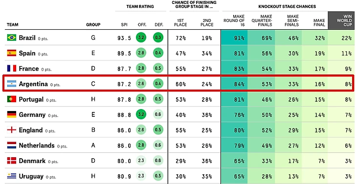 FiveThirtyEight чуть менее оптимистично оценивал Аргентину – до турнира ставил ее на четвертое место с вероятностью выхода из группы в 84%.