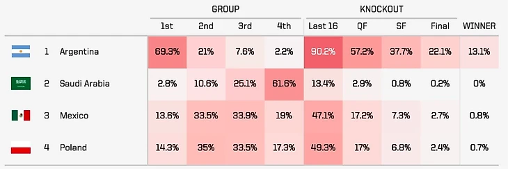 Что сейчас? Шансы на выход из группы упали до 55%, на чемпионство – до 9%. Понятное дело, что многое зависит от матча Мексики и Польши, но уже точно можно утверждать, что Аргентина перестала быть фаворитом турнира. Возможно, временно. Интересно, что Саудовская Аравия, несмотря на победу, остается последней команды группы по шансам.