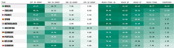 Начнем с модели прогнозов от Opta. Коротко, как это работает: на основе продвинутых данных (не только xG) каждой команде присваивается индекс. Исходя из него, просчитываются вероятности всех исходов в матче. Далее – несколько тысяч симуляций всех матчей ЧМ, на основе которых выводится таблицами с шансами для каждой команды.