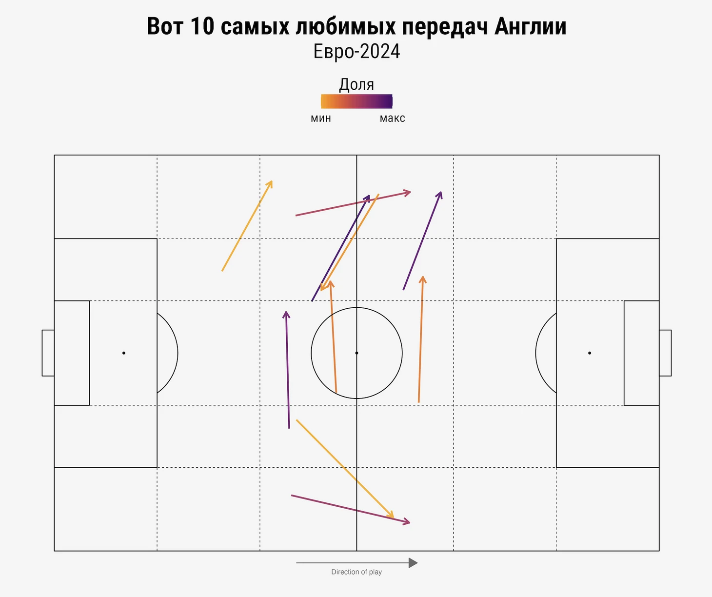 Если не учитывать стандарты, Англия на турнире отдала 1544 паса. Если разделить их на кластеры и выбрать 10 самых распространенных, получится такая картина.