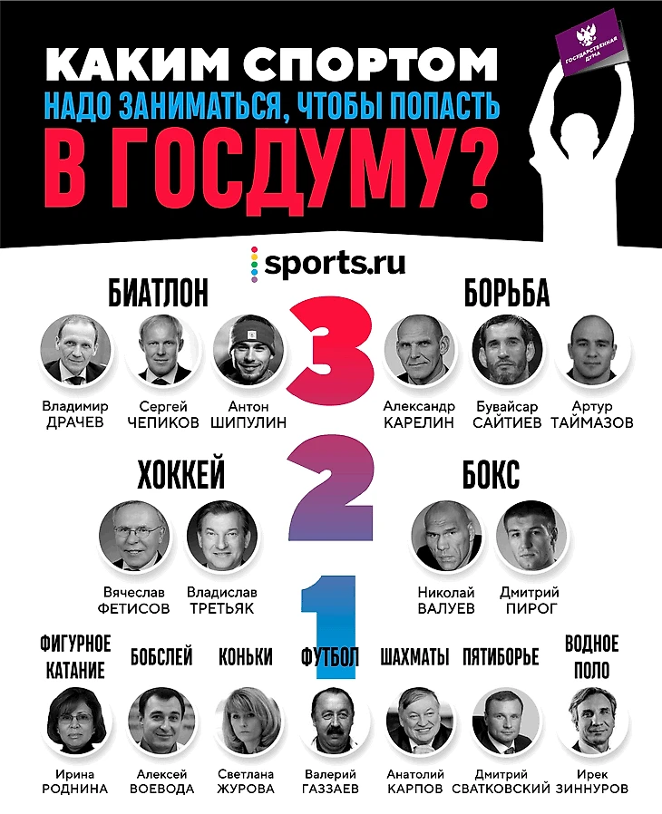 Вслед за биатлоном и борьбой наиболее перспективны для политической карьеры хоккей и бокс – по 2 депутата. Есть шансы пробиться из фигурного катания, шахмат, футбола, коньков и даже бобслея, водного поло и современного пятиборья.