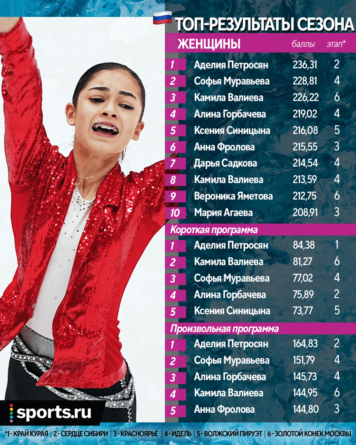 ● Аделия Петросян – безоговорочно лучшая фигуристка сезона в России, даже несмотря на очевидный кризис четверных. За две произвольных программы чистым получился только четверной флип в Омске, но это все равно позволило ей выиграть два этапа – единственной в женской серии (и был еще тройной аксель в Уфе, тоже единственный на всех).