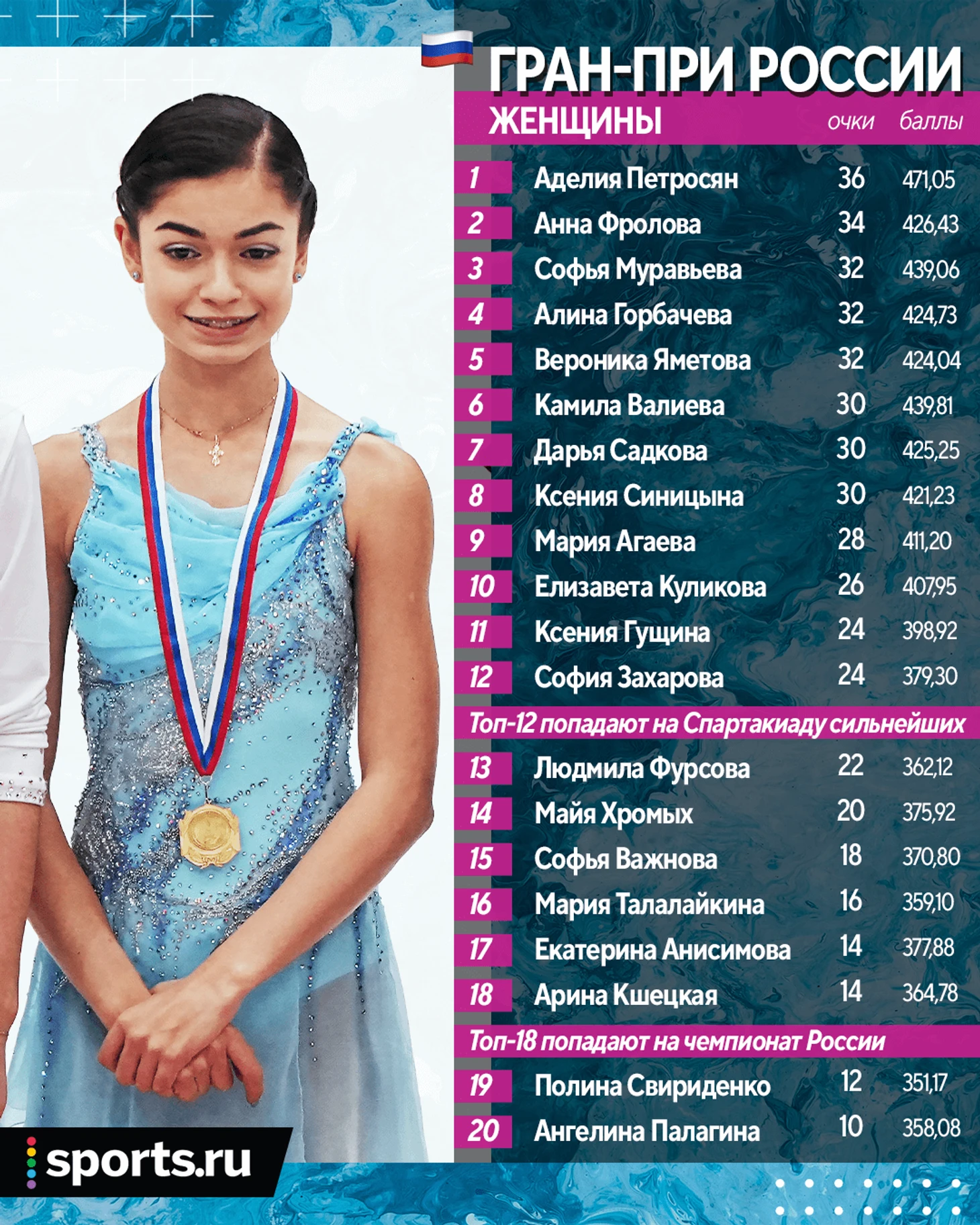 ● Кстати, из прошлогодней топ-10 общего зачета Гран-при сразу пять фигуристок пропустили новую серию: у Акатьевой и Зининой травмы, Туктамышева и Трусова просто не выступают, а Софья Самоделкина готовится к прокатам за Казахстан.