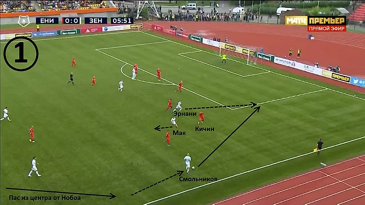 Смольников, получив мяч от Нобоа, практически сразу готовится отдать вперёд на забегающего Эрнани. Мак делает ложный рывок в центр, чем на мгновение стягивает внимание Кичина, который не смог перехватить этот пас.