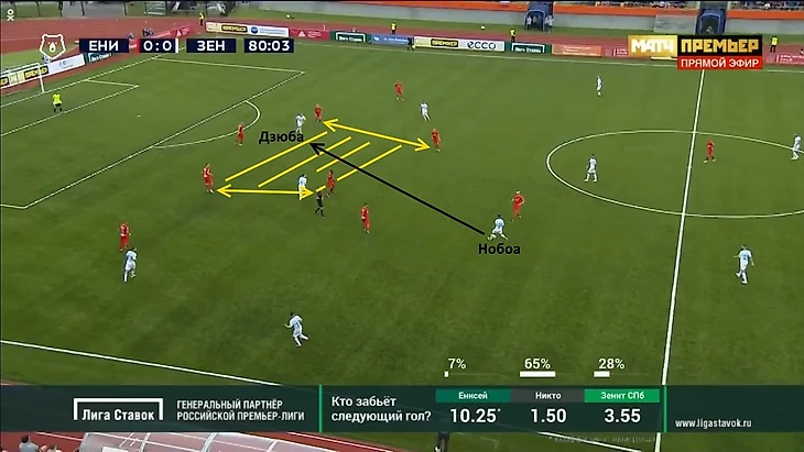 Ситуация была следующая: Обрадович и Саркисов выбежали прессинговать ЦЗ «Зенита», а затем Марко побежал оказывать давление и на Лунёва; за ними, естественно, выдвинулась и линия центральных полузащитников. Андрей вынес мяч, Шатов выиграл верх, после чего транзитом через Набиуллина мяч оказался у Нобоа. Всё это время центрхавы «Енисея» чересчур вальяжно перестраивались, в результате чего, оставили серьёзные разрывы между линиями. Туда и последовал пас от Нобоа к Дзюбе, дальше борьба, отскоки и Артём открыл счёт в матче.