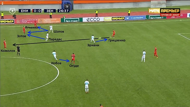 В данной ситуации позиционную ошибку допустил Паредес. Эрнани прессингует Грицаенко, Нобоа опекает Огуде, Шатов находится в удачной позиции, из которой контролирует линию передачи как на Зотова, так и на Ятченко. Леандро, по логике, должен перекрывать возможный пас на Комолова, однако он также был ориентирован на Зотова. В результате, одной передачей Грицаенко отрезает сразу 6 игроков «Зенита».