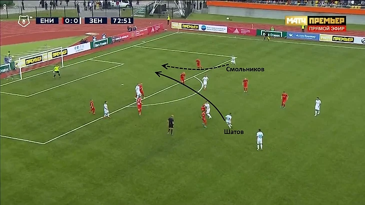 Центр перекрыт наглухо, поэтому Шатов пытается забросить в штрафную под забегание Смольникова.