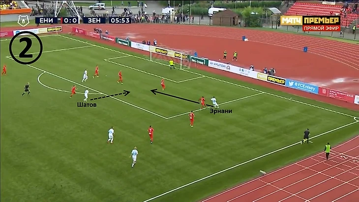 «Зенит» играл по схеме 4-2-3-1 с двумя глубинными плеймейкерами, Нобоа и Паредесом, в опорной зоне. Идея заключалась в том, чтобы доставлять мяч во фланг/полуфланг средними передачами, с чем наши опорники неплохо справлялись. Они оба были устойчивы под давлением, поэтому проблем с первым пасом не возникало. Основным плюсом этого способа построения атак является отрезание первой линии прессинга без риска потери в центральной трети, а также создание перегрузов в фланговых зонах, что упрощает обострение. Интересно было наблюдать за движением группы атаки. Шатов ожидаемо тяготел к центру, оставив фланг Набиуллину, Эрнани, игравший на позиции десятки, активно играл без мяча, часто забегал за спины соперникам, принимая те самые забросы из центра (как и Шатов в общем-то). Дзюба периодически пытался смещаться в глубину, на фланги, уводя за собой соперников, но не сказать, что это сильно помогало развивать атаки, а в штрафной его часто не хватало. Давайте рассмотрим предметно: