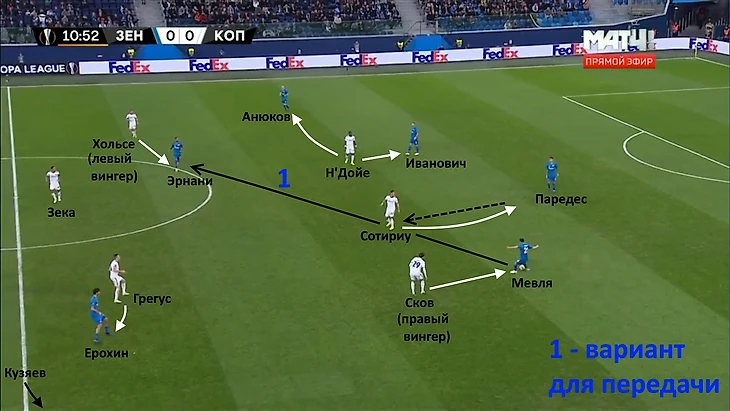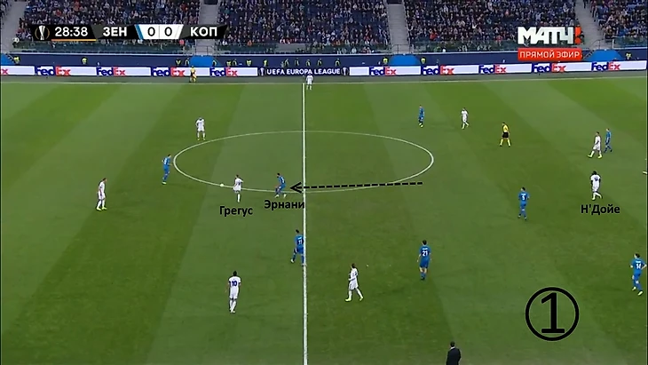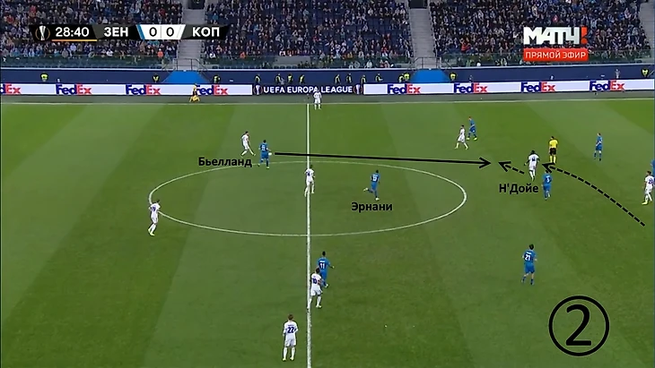 Однако не всё было так гладко – двумя путями удавалось-таки «Копенгагену» разбивать оборонительные редуты «Зенита». Первый – это смещения Н’Дойе в глубину в зоне Эрнани. Экс-форвард «Локомотива» действительно здорово чувствовал небольшие провалы бразильца, моментально открываясь в освобождавшиеся зоны, благодаря чему датчане разбивали линии своего соперника.