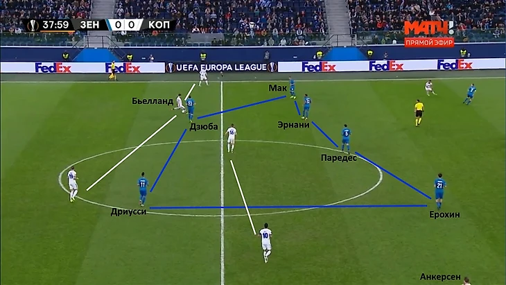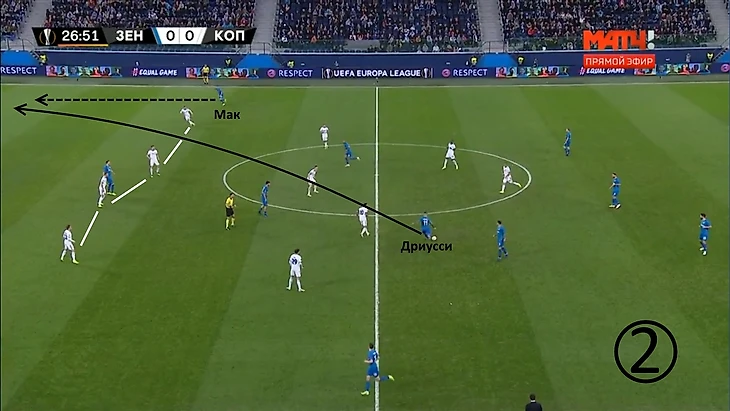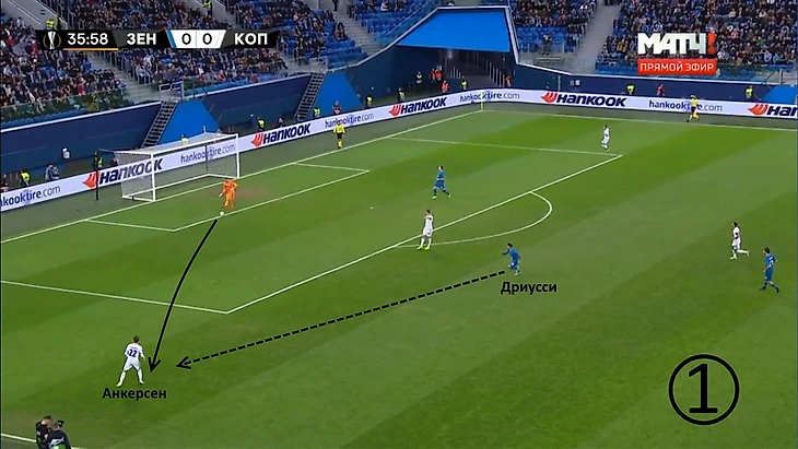 «Зенит» совершает неудачную попытку высоко запрессинговать. Дриусси не успеет накрыть Анкерсена, который забросит по диагонали в центр.