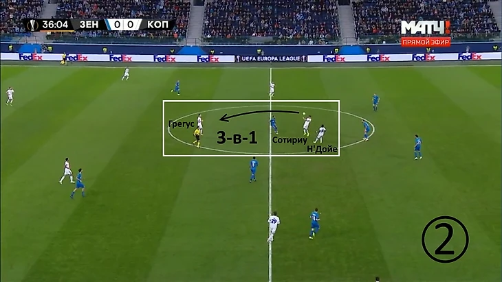 Сотириу и Н’Дойе (нападающие «Копенгагена») боролись за лонгболл, проиграли данное единоборство, а мяч отскочил к Кузяеву. При этом линия полузащиты не поджимает, следовательно, контрпрессинг не применяется, и «Зенит» может спокойно установить владение.