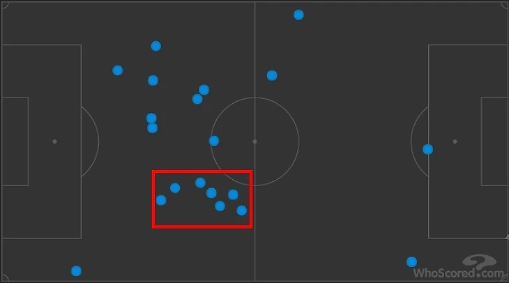 Примечательна и карта касаний Н‘Дойе в первом тайме. Посмотрите, как они скоплены в зоне Эрнани:
