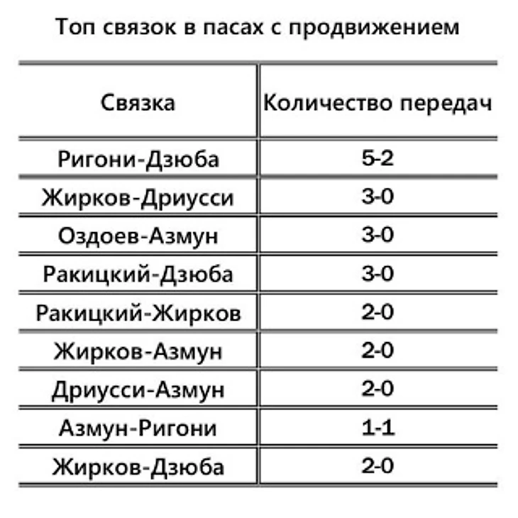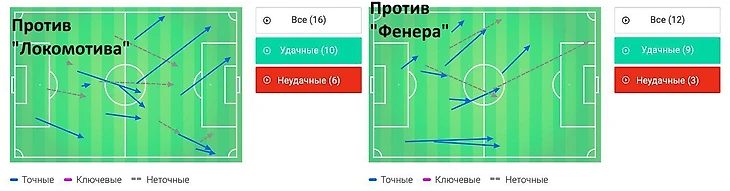 Создавать свои моменты «Сине-Бело-Голубым» удавалось в основном за счёт отбора мяча и выигранных подборов, разгоняя атаку быстро пока соперник не успевал вернуться в своё оборонительное построение. Особенно хорош был в создании таких атак Оздоев: сумма его подборов и отборов составила 13, также из своих 39 передач он отдал 16 вперёд. Матчи с большим числом переходных фаз – вообще стихия Магомеда. Возьмём для сравнения его показатели в игре с «Фенербахче» дома, к примеру: сумма подборов и отборов – 11, передач вперёд из 36 – 12.