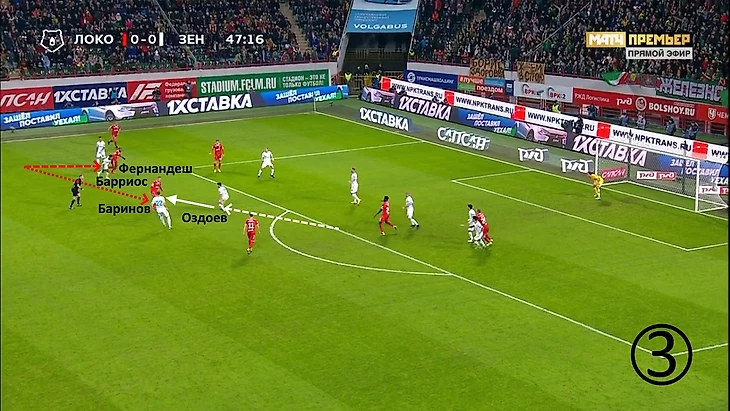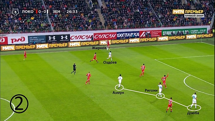 С выходом Фернандеша «Локо» ожидаемо начал больше задействовать зоны между линий, но «Зенит» оборонялся очень качественно: вингеры почти что не теряли своих игроков, опорники «цементировали» подходы к штрафной.