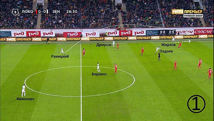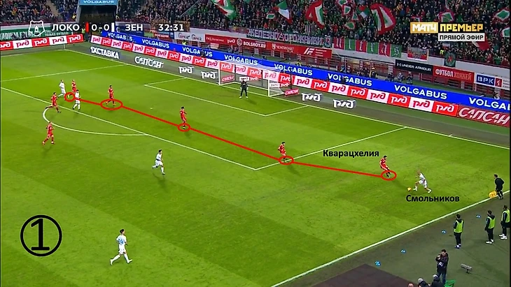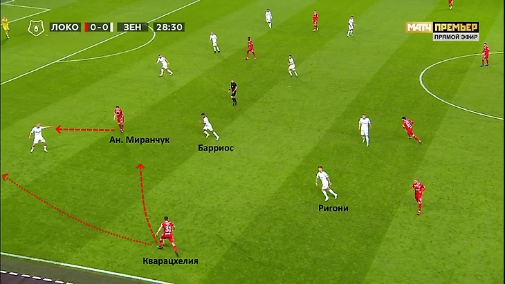 Кварацхелия получил мяч на фланге. Ригони отрезан, перед ним свободное пространство и открывающийся из-за спины Смольникова Антон Миранчук. Вместо того, чтобы снабдить партнёра мячом, тем самым задав темп атаке, он начал смещаться в зону, которую уже успевал закрыть Барриос. В итоге атака «Локо» не получила дальнейшего развития.