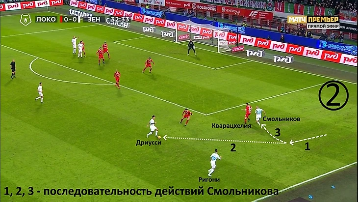 Смольников, приняв мяч, сместился глубже, отдал на Дриусси и побежал в штрафную. Кварацхелия дисциплинированно следовал за ним, поэтому Дриусси пришлось пасовать во фланг на набегающего Ригони.