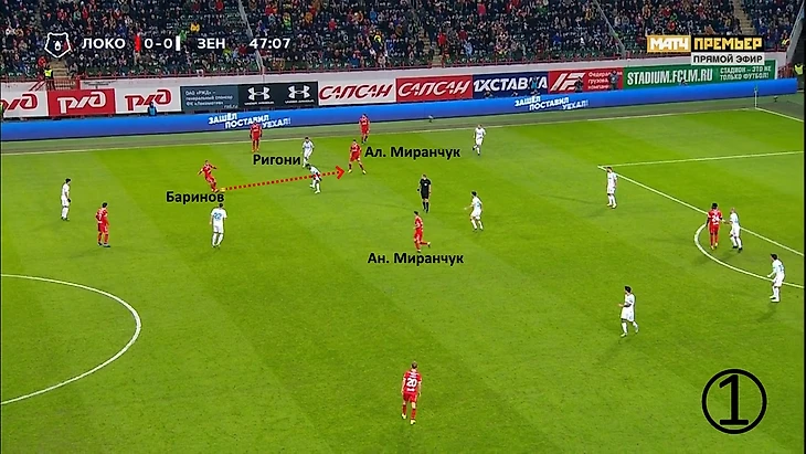 Баринов отдаст на Алексея Миранчука между линий, однако Ригони настигнет его и не даст развить атаку. Любопытная деталь: Баринов смотрел на Антона Миранчука до последнего, но отдал не ему. Во многом благодаря этому передача прошла.
