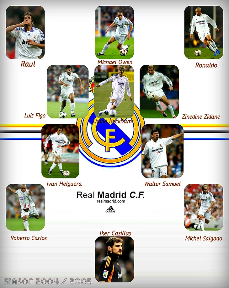Ещё год назад сделал эту картинку и всё никак не найду подходящего повода её выложить на Sports'e Здесь "галактикос", образца сезона 2004/2005 - в своём "полном галактическом" и звёздном (на мой вкус) составе. И, кстати говоря, - в довольно условной расстановке, т.е. скорее для красоты и чтобы вспомнить всех главных звёзд того Реала...