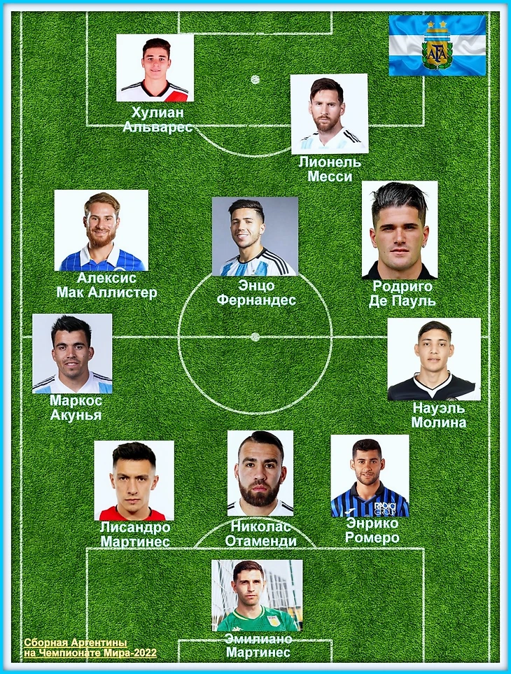 Константин Генич перечислил Денису Казанскому (который сомневался, что можно с разбегу назвать вероятный состав Аргентины на финал), кто будет у Аргентины в стартовом на финал и добавил: "Сфотографируйте. Вот такой состав будет у Аргентины." (с) Константин Генич ("Коммент.шоу", 15.12.) Вот собственно это "Фото". Расстановка из всех тех, кого назвал Генич.