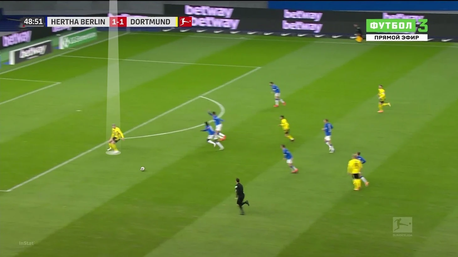 Взгляните на гол в ворота «Герты». Позиция позволяет Холанду обработать мяч и продвинуться к воротам, но Эрлинг готовится к удару в одно касание.