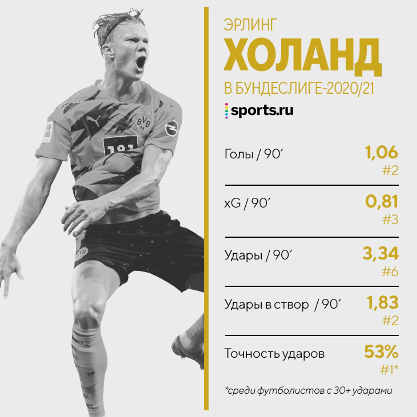 Статистика бомбардиров в топ-5 лигах тоже красноречива: 3,34 удара Холанда в пересчете на 90 минут явно уступают среднему показателю футболистов, уже забивших 15+ голов в сезоне (3.83). Но с ударами в створ все иначе – 1,83 у норвежца, лишь 1,7 у лучших снайперов.