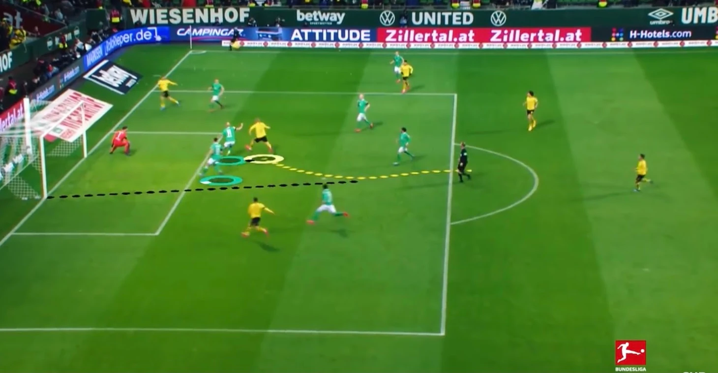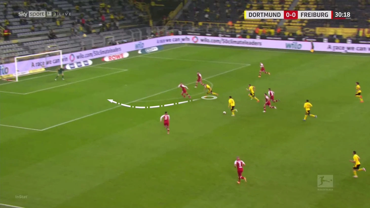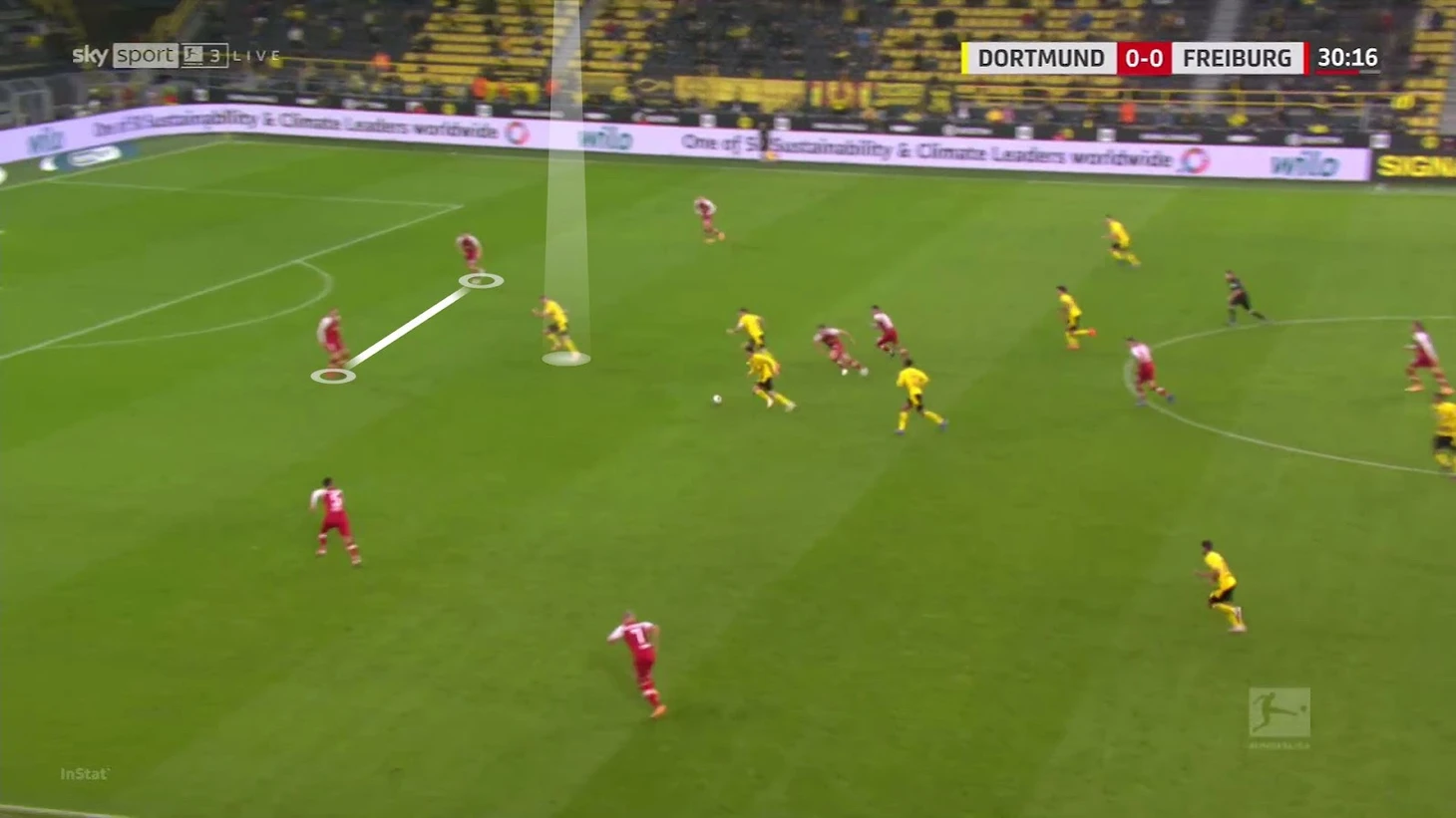 Наглядный пример – гол «Фрайбургу». «Дортмунд» перехватил мяч и помчался вперед, Холанд располагается между центральными защитниками, бежит прямо.
