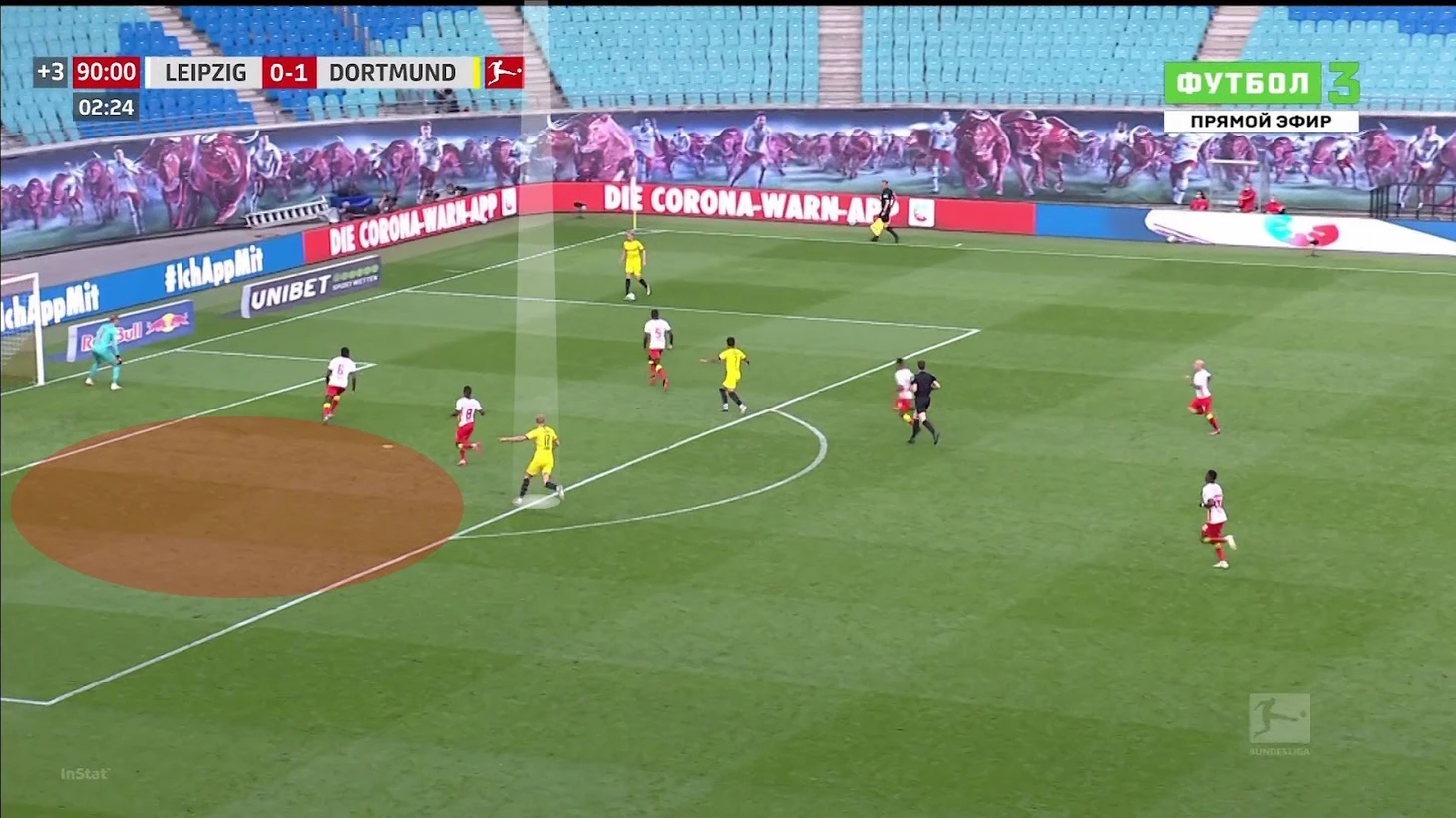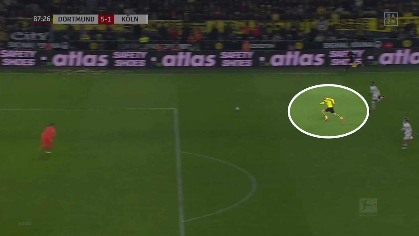 Главное оружие норвежца в штрафной – ускорения после ложных движений. Холанд спокойно направляется в сторону дальней штанги, набирает скорость и вдруг кардинально меняет направление, устремляясь к ближней.