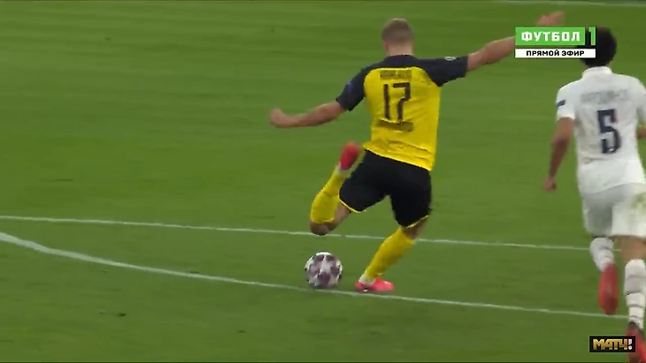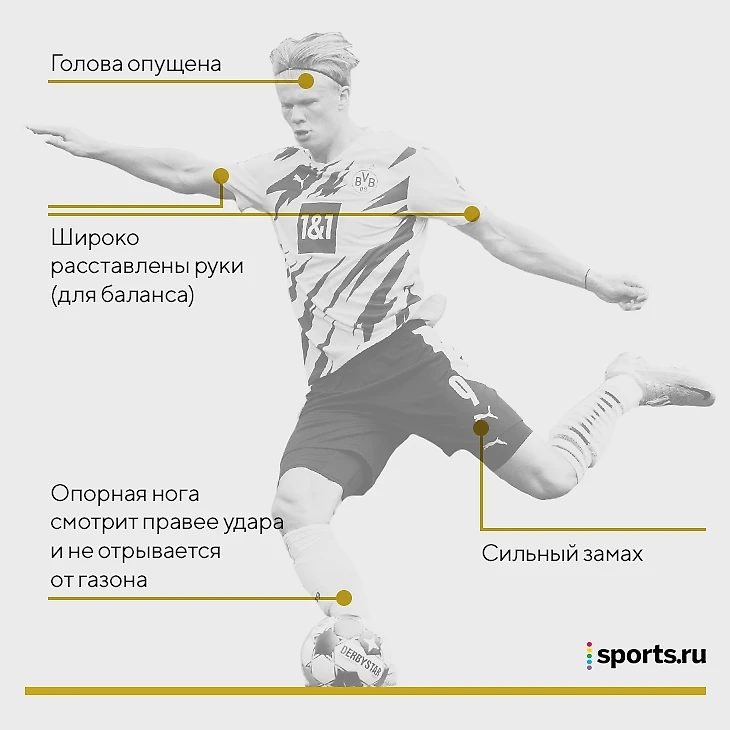 Холанд после удара. Не оторвал опорную ногу от газона, бьющая нога не последовала за мячом, сразу вернулась на землю. Очевидно, у Эрлинга сильно развит голеностоп – при его весе и силе замаха опорная выдерживает огромный вес.