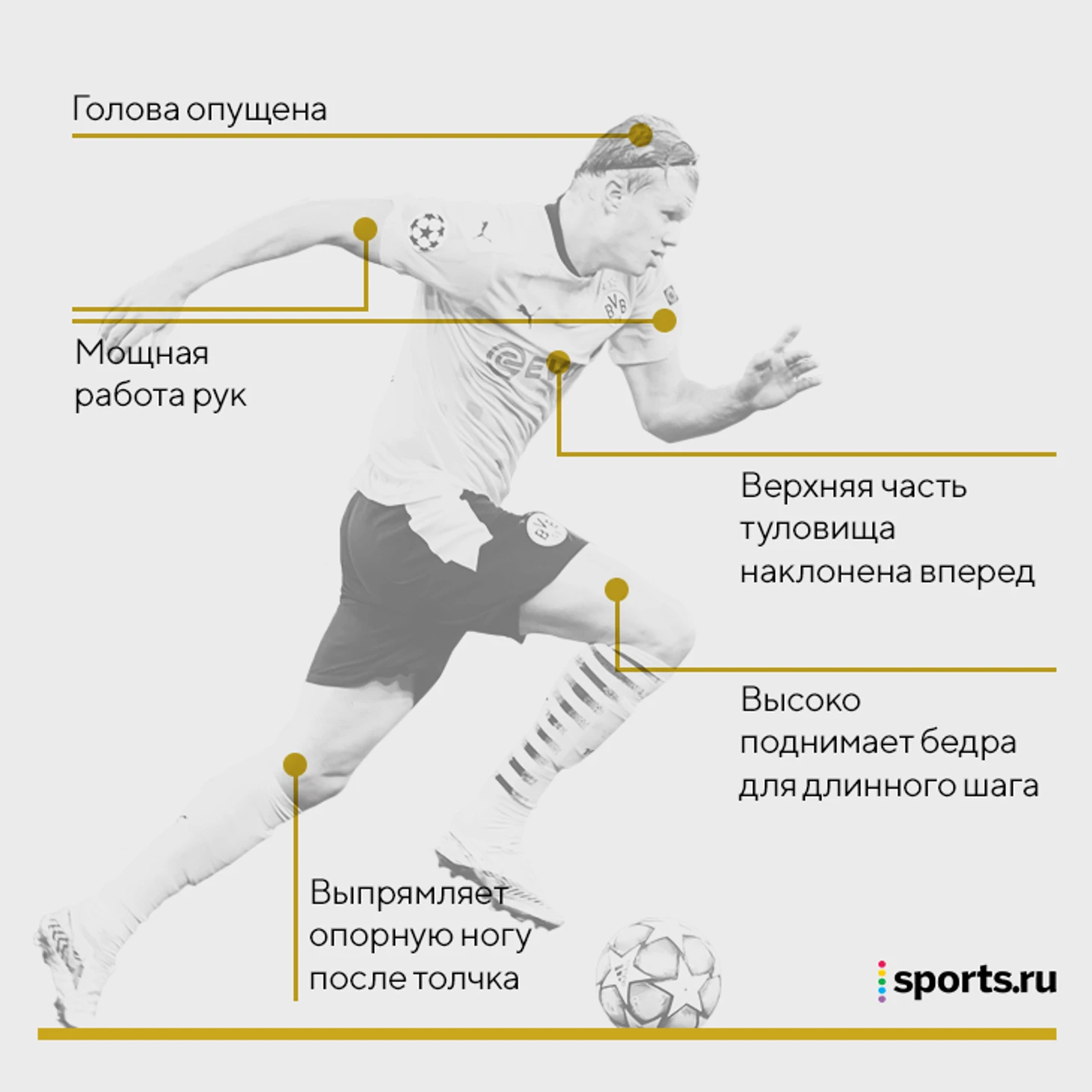 Вот как это работает: на старте спринта Холанд пригибается, голова опущена. При наборе скорости верхняя часть туловища максимально выдвинута вперед. Его центр тяжести перемещается наверх, благодаря чему Эрлинг легче управляет направлением движения. Может показаться, что норвежец постоянно заваливается вперед, пытаясь устоять на ногах. На самом деле это дает 194-сантиметровому Холанду необходимый баланс. Он мощно работает руками и широко расставляет их по сторонам, чтобы лучше координировать движение и мобильнее поворачивать.